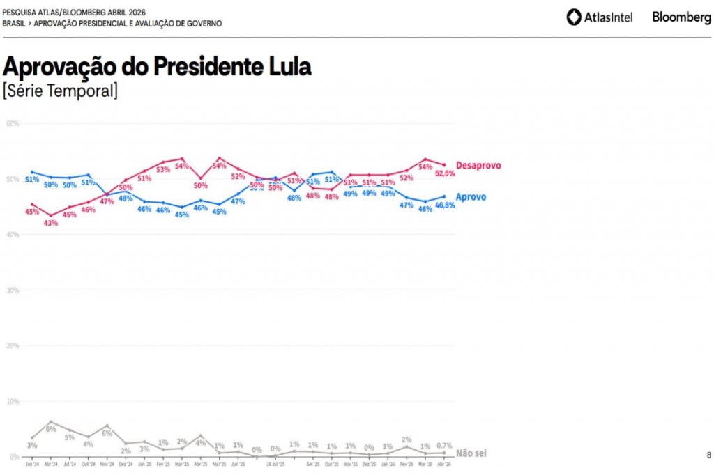 Brancos, nulos e indecisos somaram 0,2%. Foram ouvidas 5.008 pessoas, por meio de recrutamento digital aleatório (Atlas RDR), entre os dias 22 e 27 de abril. A margem de erro é de um ponto percentual, para mais ou para menos, com nível de confiança de 95%.