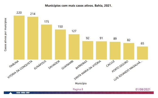 O documento mostra que Itabuna, no Litoral Sul do estado, lidera em número de casos ativos com 220 ocorrências. Em segundo lugar está Vitória da Conquista, no Sudoeste baiano, e seus 214 casos.