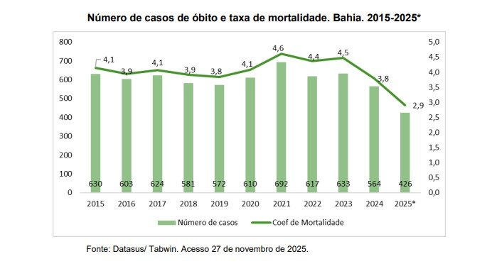 O dado foi inferior aos obtidos nos anos consecutivos, quando foram registrados 16,9% em 2021; 18,5% em 2022; 22,1% em 2023 e 22,2% em 2024. Já neste ano, a taxa ficou em 18,3% até o último dia 27 de novembro. Os números de Aids também registraram um aumento e uma variação no mesmo período, onde foram obtidos 5,7% em 2020, 7,4% em 2021 seguido por 8,4% em 2022 e 8,5% no ano retrasado. Já no ano passado o índice ficou em 7,7% e 5,7% neste ano.