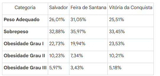 Na Obesidade Severa (Graus II e III), o município soteropolitano apresentou índices consideravelmente maiores. A capital tem 10,23% de Obesidade Grau II e 5,97% de Grau III, enquanto Feira de Santana registra 7,34% e 3,43%, respectivamente.