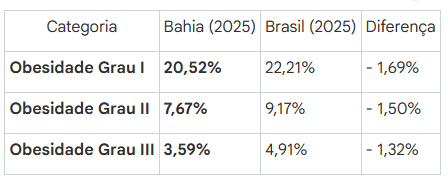 Em contraste, regiões como Irecê (26,64% total) e Seabra (25,23% total) apresentam os menores índices de obesidade entre as áreas monitoradas no estado. Na comparação com a média nacional, a Bahia apresenta indicadores de saúde nutricional mais positivos no que diz respeito à obesidade, mantendo percentuais abaixo da média brasileira em todos os graus da doença, tanto em 2024 quanto em 2025.