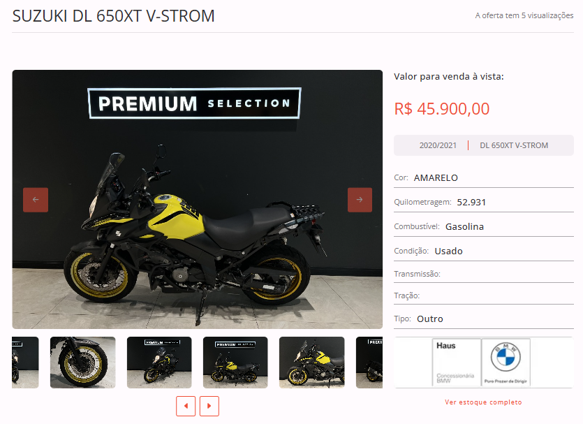 Entre as opções disponíveis em nosso site, está um SUZUKI DL 650XT V-STROM, cor amarela, ano 2020/2021, na loja BMW Haus Motors. Todas as informações de contato estão disponíveis na nossa plataforma.