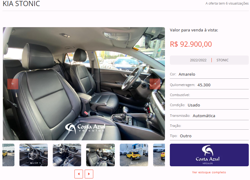 Entre as opções disponíveis em nosso site, está um KIA STONIC, cor amarela, ano 2022/2022, na loja Costa Azul Veículos. Todas as informações de contato estão disponíveis na nossa plataforma.