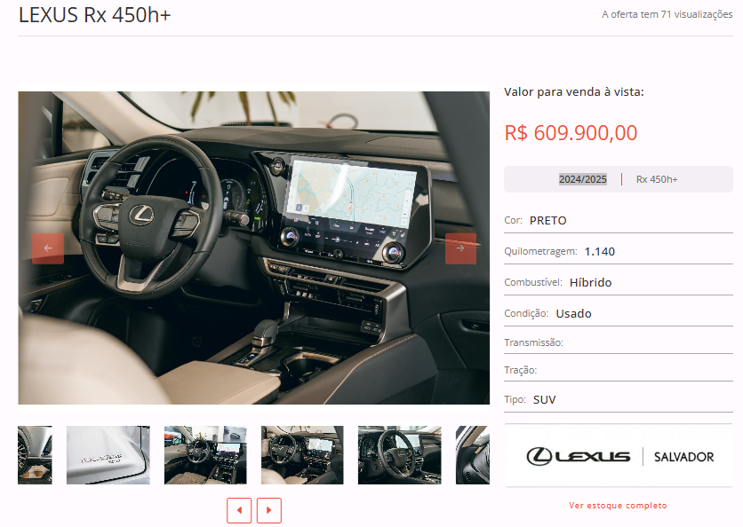 Entre as opções disponíveis em nosso site, está um LEXUS Rx 450h+, cor preto, ano 2024/2025, na loja Lexus Salvador. Todas as informações de contato estão disponíveis na nossa plataforma.