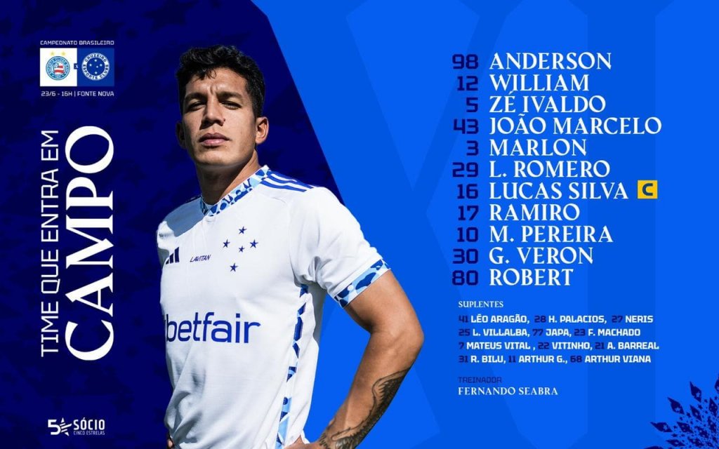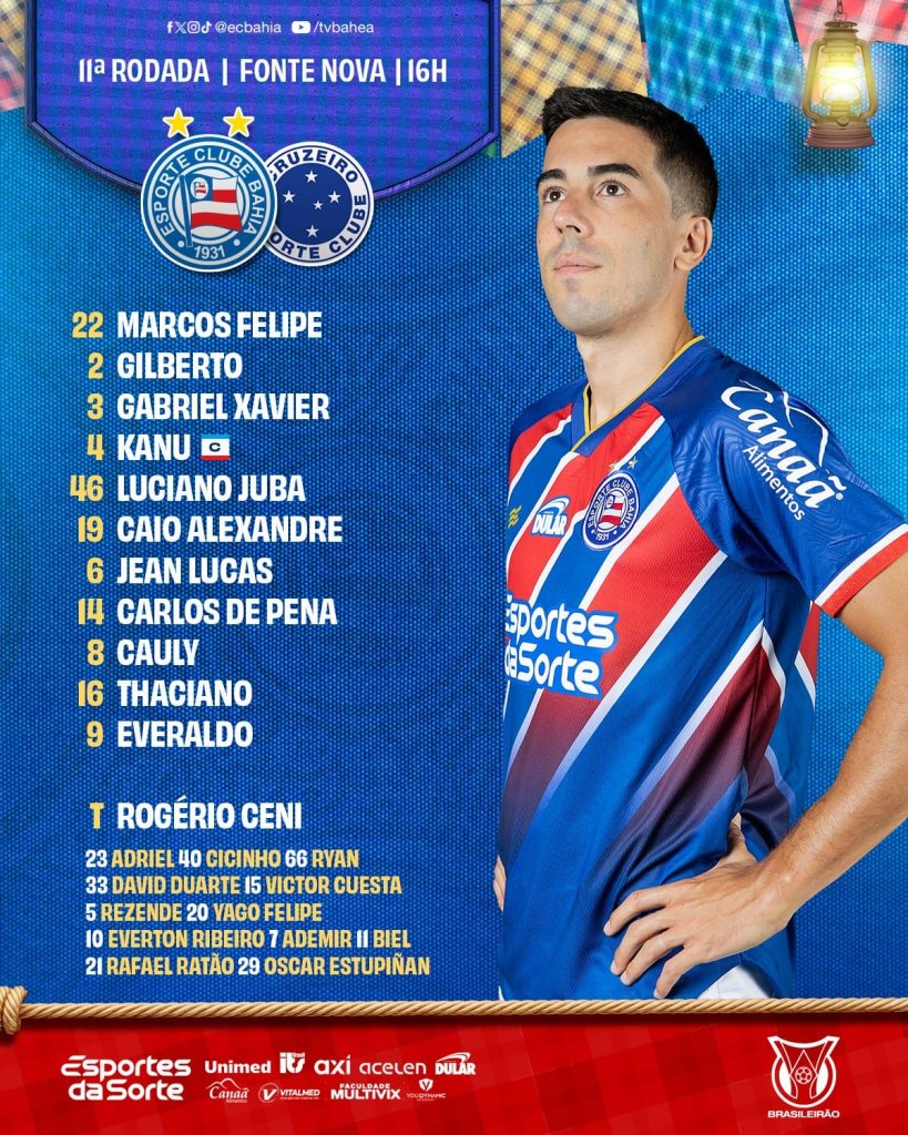 Bahia e Cruzeiro se enfrentam na tarde deste domingo (23), pela décima primeira rodada do Campeonato Brasileiro 2024. A bola rola às 16h, na Casa de Apostas Arena Fonte Nova e ambas as equipes já estão escaladas para o confronto. Confira: