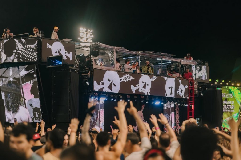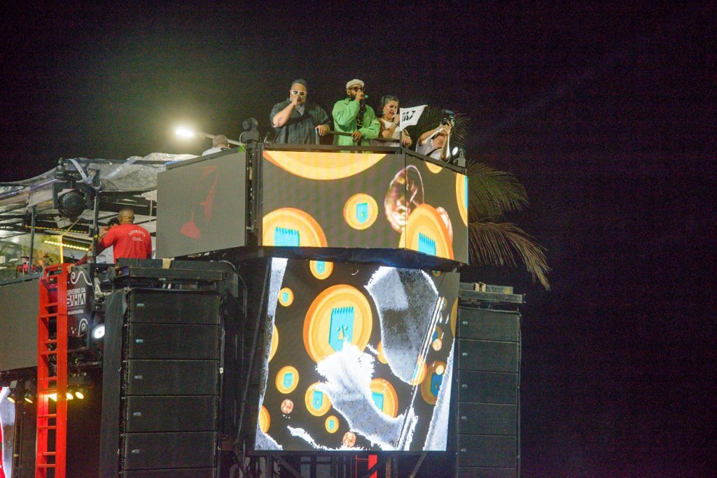 Ao som de clássicos como “Balacobaco” e “Forasteiro”, o grupo levou para a avenida a uma proposta de Carnaval de Paz, mantendo as fanfarras e a estética sonora que marcam a identidade da banda. No trio, a chamada Máquina de Louco ganhou reforços especiais, com as participações de Larissa Luz, Vandal, Ágatha Macêdo e Melly.