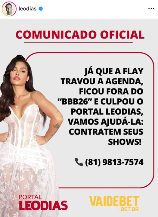 "Já que a Flay travou a agenda, ficou fora do BBB 26 e culpou o Portal Leo Dias, vamos ajuda-la: contratem seus shows!", escreveu.