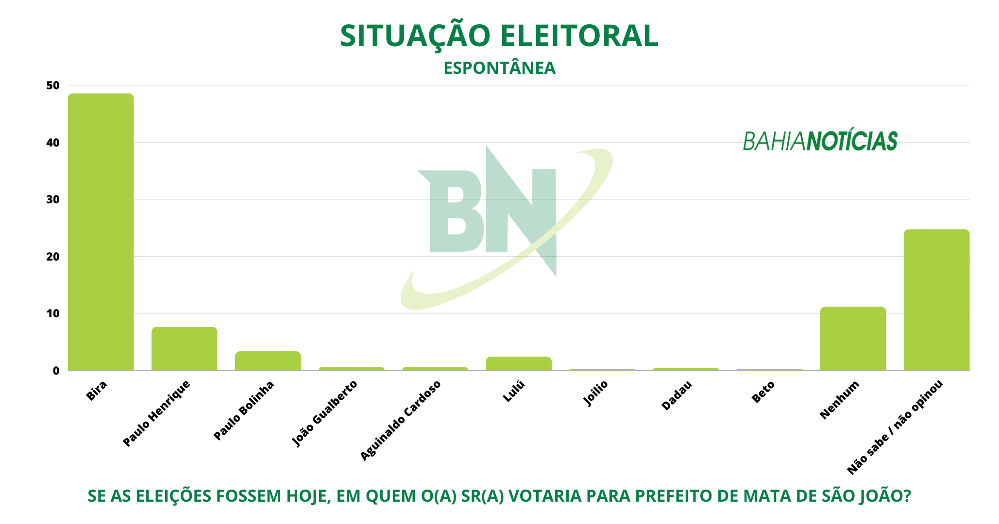 No que diz respeito a corrida eleitoral, Bira aparece como o favorito, com 48,60% das respostas, em entrevista espontânea, quando não são apresentados os nomes dos candidatos. 7,64% dos eleitores respondeu o nome do candidato Paulo Henrique; Paulo Bolinha aparece em terceiro lugar com 3,35%; Lulu com 2,42%; João Gualberto e Aguinaldo Cardoso aparecem, ambos, com 0,56%; Dadau com 0,37%; com 0,19% aparecem Joilio e Beto do Amado-Bahia; outros 24,77% dos munícipes não opinaram ou não souberam responder e 11,17% não votariam em nenhum candidato.