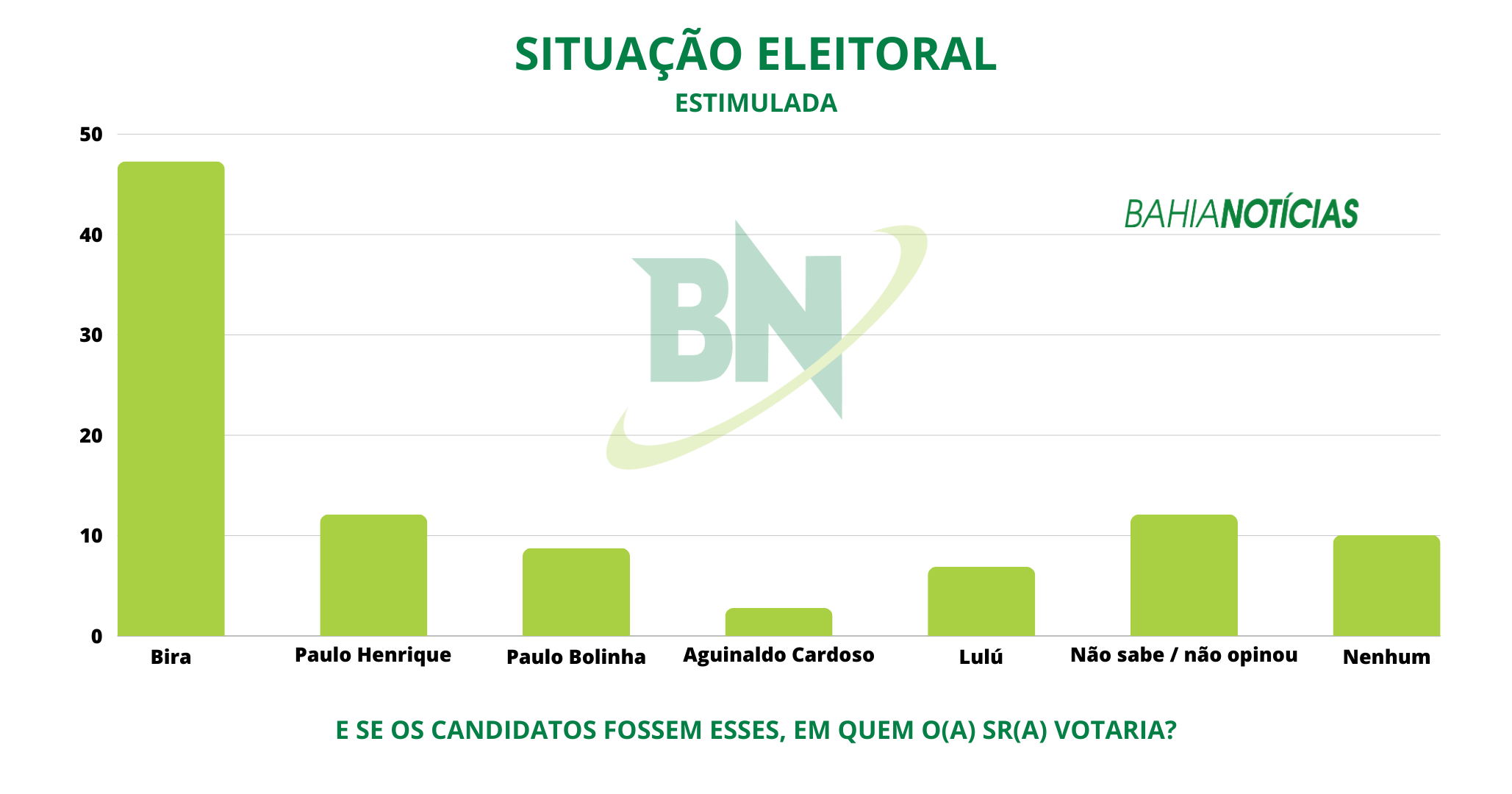 Em entrevista estimulada, quando são apresentados os nomes dos candidatos, Bira aparece em 47,30% das respostas, seguido por Paulo Henrique e Paulo Bolinha, com 12,10% e 8,75% respectivamente. Lulu aparece com 6,89% das intenções de voto e Aguinaldo Cardoso com 2,79%. Outros 12,10% não souberam responder e 10,06% não votariam em nenhum candidato.
