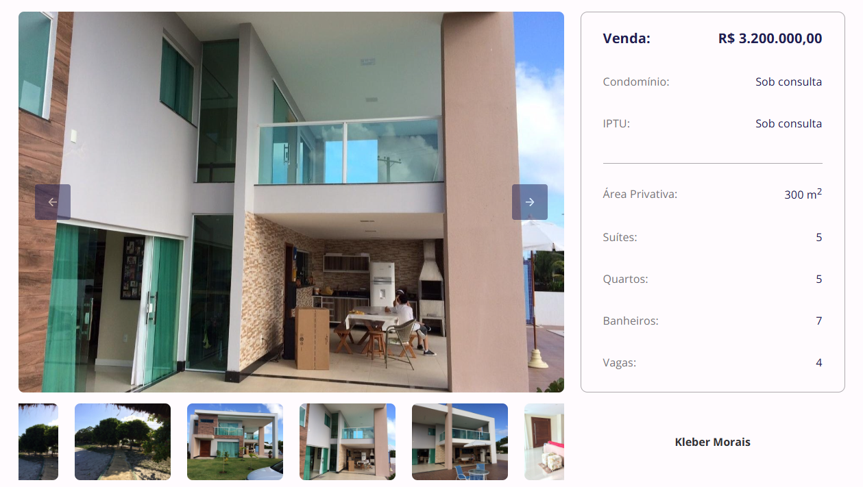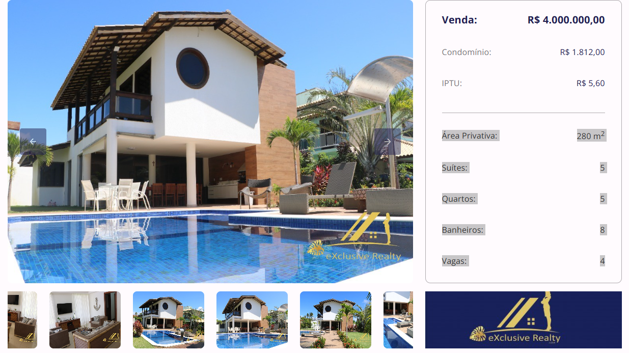 Um dos imóveis disponíveis é uma casa de 300 m² na Praia de Guarajuba, o imóvel sendo uma casa padrão luxo no Condomínio Paraíso dos Lagos, na Praia de Guarajuba. O imóvel conta com 5 dormitórios, sendo 5 suítes, 7 banheiros, acabamento de alto padrão, ambientes amplos e bem distribuídos, piscina privativa, área gourmet com churrasqueira e 4 vagas de garagem. São 300 m² de área privativa em um dos melhores condomínios de Guarajuba, oferecendo conforto, sofisticação e excelente localização.