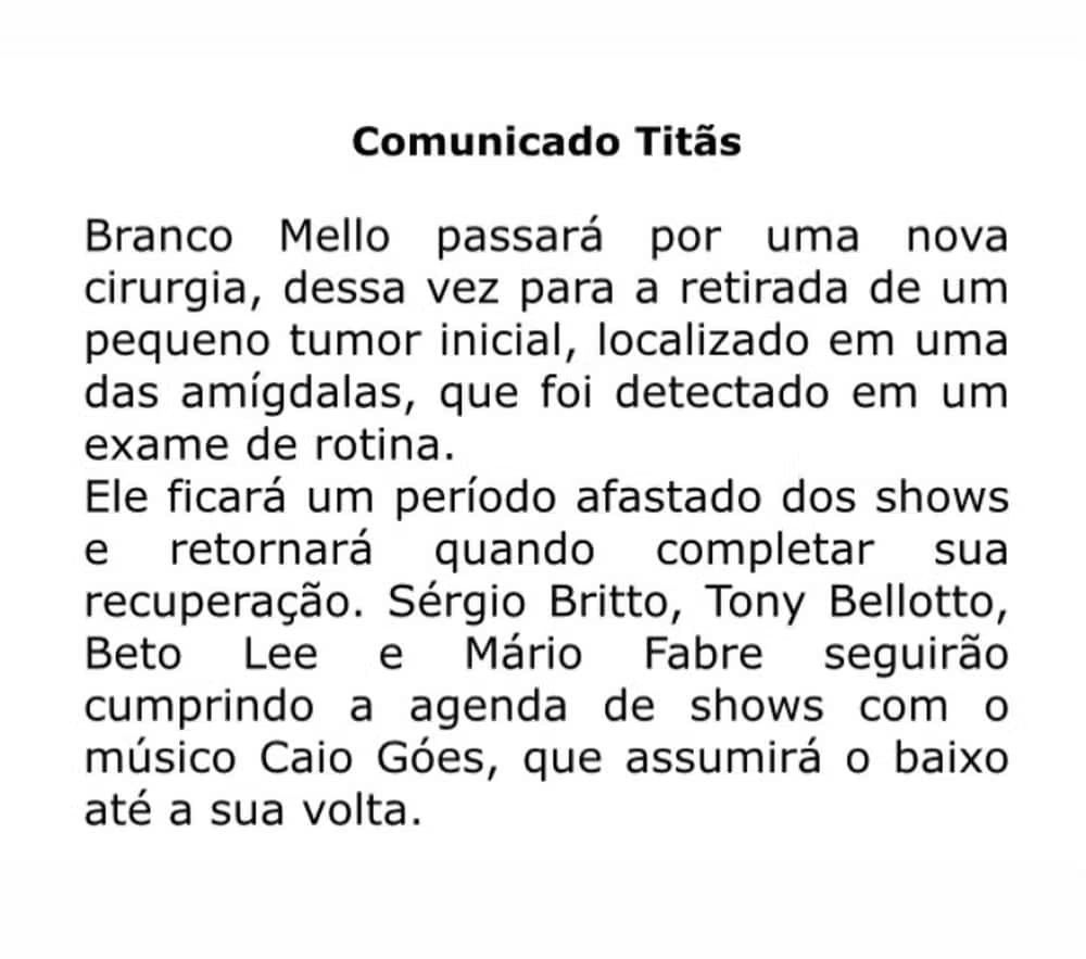 Segundo o comunicado divulgado nas redes sociais do grupo, no último dia 23 de julho, Branco Mello ficará afastado dos shows durante o período de recuperação. O músico Caio Góes substituirá o artista no baixo até o seu retorno.