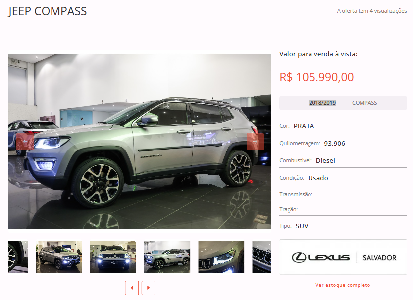 Entre as opções disponíveis em nosso site, está um JEEP COMPASS, cor prata, ano 2018/2019, na loja Lexus Salvador. Todas as informações de contato estão disponíveis na nossa plataforma.
