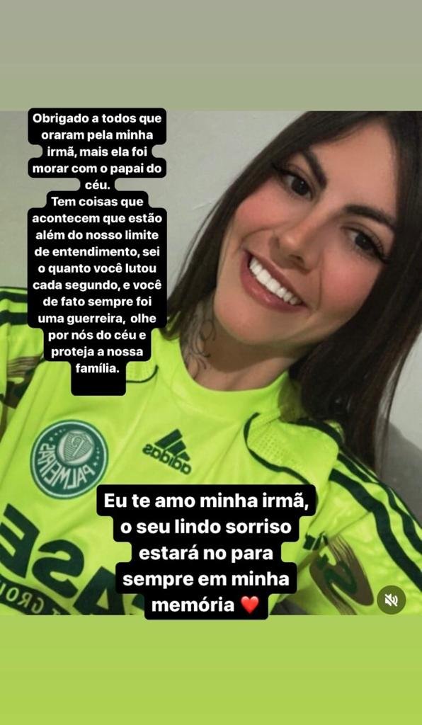 "Obrigado a todos que oraram pela minha irmã, mas ela foi morar com o papai do céu. Tem coisas que acontecem que estão além do nosso limite de entendimento. Sei o quanto você lutou cada segundo, e você de fato sempre foi uma guerreira. Olhe para nós do céu e proteja a nossa família. Eu te amo, minha irmã. O seu lindo sorriso estará para sempre em minha memória", escreveu.
