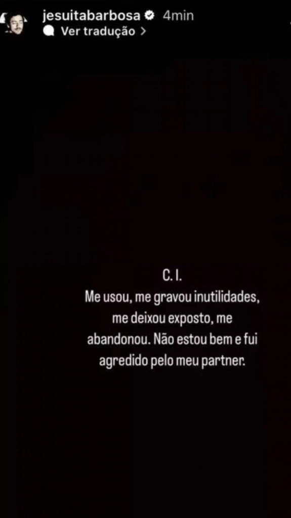 “C.I Me usou, me gravou inutilidades. Me deixou exposto, me abandonou. Não estou bem e fui agredido pelo meu partner [parceiro, em tradução livre]", escreveu o ator.