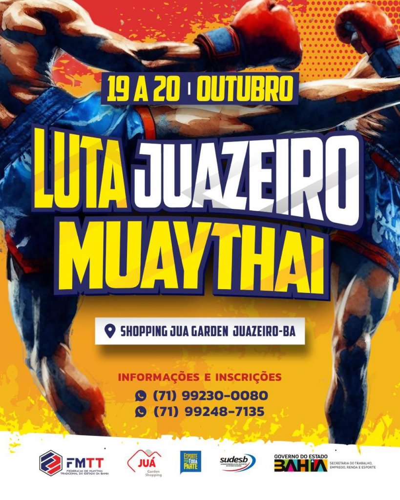 Nos dias 19 e 20 de outubro, Juazeiro será palco do evento Luta Juazeiro de Muaythai, reunindo atletas e entusiastas da modalidade. Organizado pela Federação de Muay Thai Tradicional do Estado da Bahia (FMTT), o evento conta com o apoio da SUDESB (Superintendência dos Desportos da Bahia) e do Governo do Estado da Bahia, prometendo duas atividades especiais no Shopping Jua Garden.