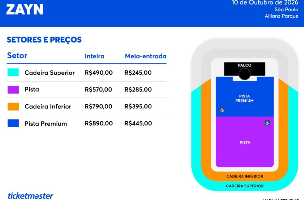 O ingresso mais barato para o show custa R$ 245, a meia entrada para a cadeira superior. Já o valor mais caro é o da pista premium, que custa R$ 890 o valor inteiro.