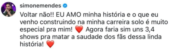 “Voltar não!! EU AMO minha história e o que venho construindo na minha carreira solo é muito especial pra mim! Agora faria sim uns três, quatro shows pra matar a saudade dos fãs dessa linda história!.”