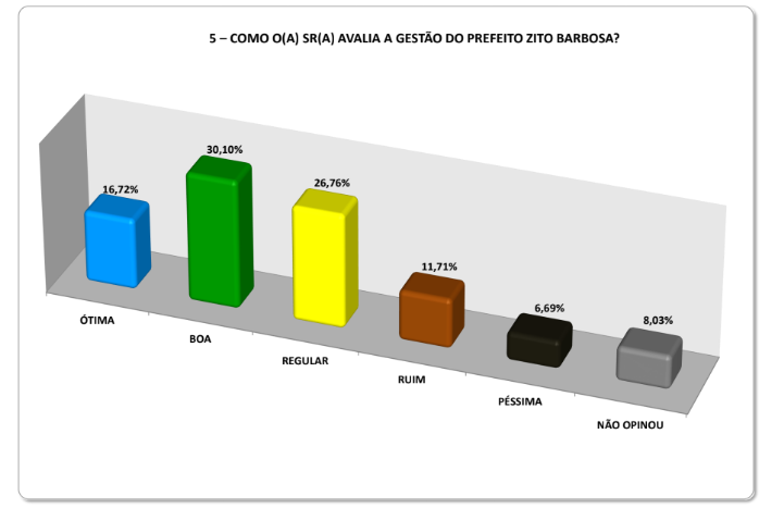A pesquisa também perguntou qual a opinião dos entrevistados se a administração de Zito foi ótima, boa, regular, ruim ou péssima. Para 30,10% é boa, 26,76% é regular, 16,72% consideraram ótima, 11,71% classificaram como ruim e 6,69% definiram como ruim. Já 8,03% não opinou sobre o questionamento.